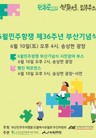 일정 전체 67건 (6페이지) 전체보기 예매준비중 예매중 예매마감 진행중 종료 전체 공연 전시 행사 축제 체험 기타 검색 행사종료 우리 모두는 서로의 운명이다 멸종위기동물 예술로 HUG 장소 잡은펼쳐보임방(기획전시실) 기간 2023-09-15(금) ~ 2023-12-03(일) 시간 09:00~18:00 상세보기 행사종료 <청소년 민주주의 상상한마당> 장소 민주공원 전역 기간 2023-08-26(토) ~ 2023-08-26(토) 시간 오후 1시 ~ 5시 상세보기 행사종료 <춤, 관객과 함께하다 - 2023 민주공원 기획공연> 장소 큰방(중극장) 기간 2023-09-02(토) ~ 2023-09-02(토) 시간 오후 2시 상세보기 행사종료 4·3창작오페라 <순이삼촌> 제작발표회 장소 민주공원 전역 기간 2023-07-28(금) ~ 2023-07-28(금) 시간 오전 10시 30분~ 상세보기 행사종료 2023 민주공원 예술놀이터 ‘샌드아트&체험’ 장소 작은방(소극장) 기간 2023-06-24(토) ~ 2023-06-24(토) 시간 오후 2시 상세보기 행사종료 6월민주항쟁 36주년 기념 전시 민중미술 2023 - 입 속의 검은 입 장소 잡은펼쳐보임방(기획전시실) 기간 2023-06-10(토) ~ 2023-08-27(일) 시간 오전 10시 ~ 오후 5시, 월요일 휴관 상세보기 행사종료 6월민주항쟁 36주년 기념 부산특별전 장소 늘펼쳐보임방(상설전시실) 기간 2023-06-08(목) ~ 2023-07-02(일) 시간 오전 9시 ~ 오후 6시, 월요일 휴관 상세보기 행사종료 6월민주항쟁 제36주년 부산기념식 장소 기타 행사 및 프로그램 기간 2023-06-10(토) ~ 2023-06-10(토) 시간 오후 4시 상세보기 행사종료 민주공원 기획공연 <발이되기> 장소 작은방(소극장) 기간 2023-06-03(토) ~ 2023-06-03(토) 시간 오후 2시 상세보기 행사종료 5·18민중항쟁 43주년 부산 기념식 장소 큰방(중극장) 기간 2023-05-18(목) ~ 2023-05-18(목) 시간 오후 7시 30분 상세보기 처음 1페이지 2페이지 3페이지 4페이지 5페이지 열린6페이지 7페이지 맨끝
