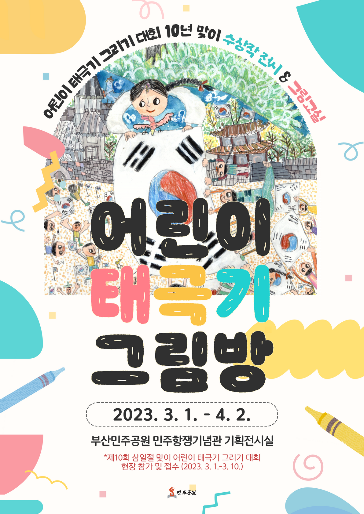 *본 전시에서 어린이들이 그린 작품은 제10회 삼일절 맞이 어린이 태극기 그리기 대회에 현장 접수됩니다. (2023. 3. 1.-3. 10.)