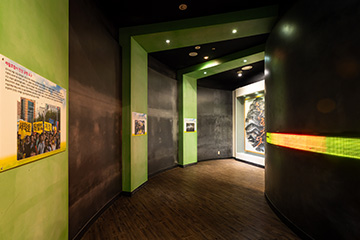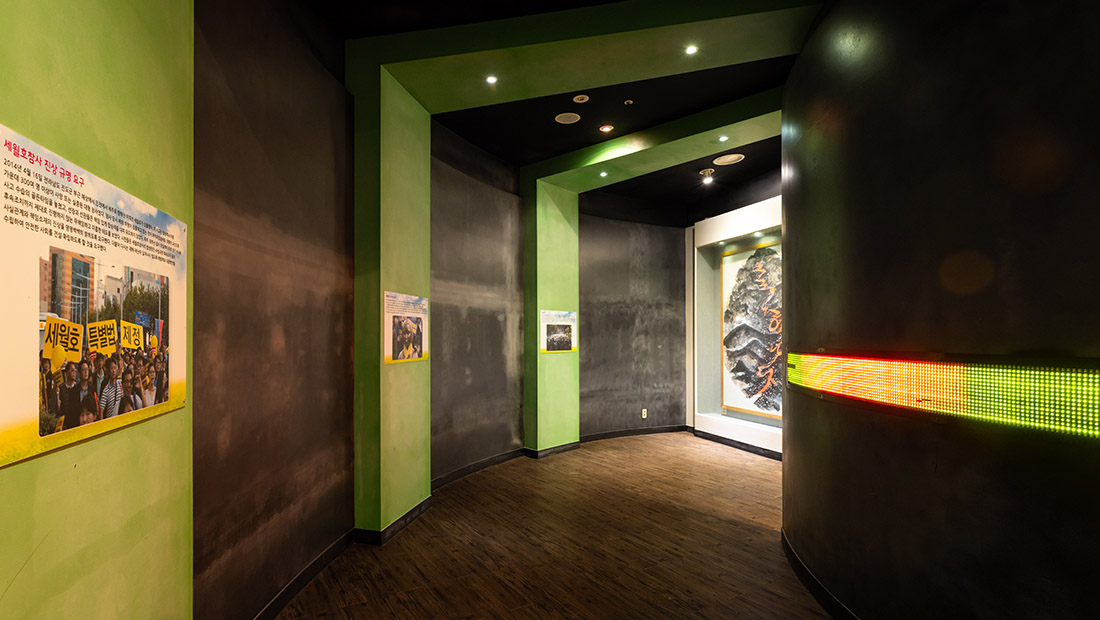 먼저 항쟁의 거리에서 늘 메아리치던 구호들이 우리를 맞이한다. 굴의 한 쪽 벽에는 갖가지 숫자와 문자들이 빛을 내며 흘러간다. 다른 쪽 벽에는 항쟁의 거리에서 싸우던 민주 시민들의 영상이 미끄러진다. 우리 근현대사를 살아왔던 민중들의 만다라가 저 너머 ‘검은 산 붉은 강’에 오롯이 살아있다.